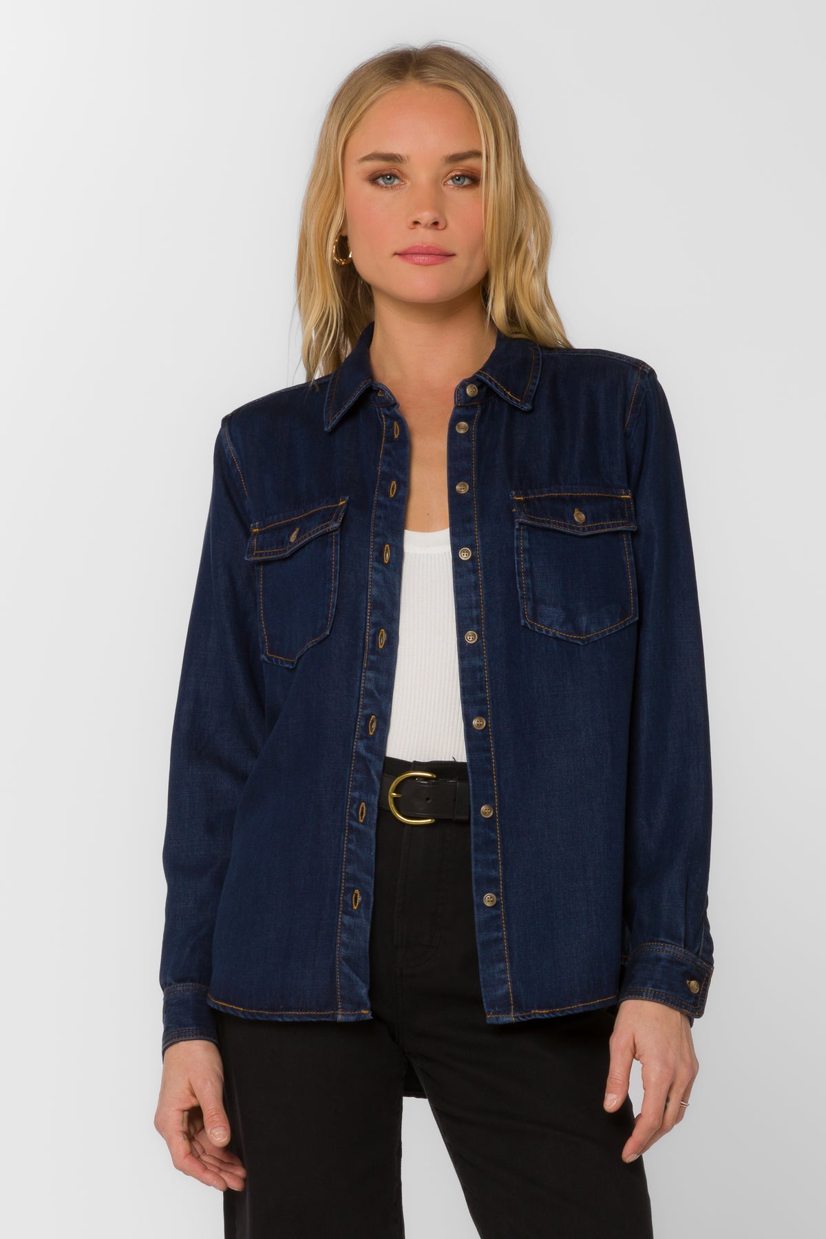 This long sleeve button-up shirt features front flap chest pockets and is crafted from an eco-friendly fabric with a soft, heavyweight texture that drapes beautifully.