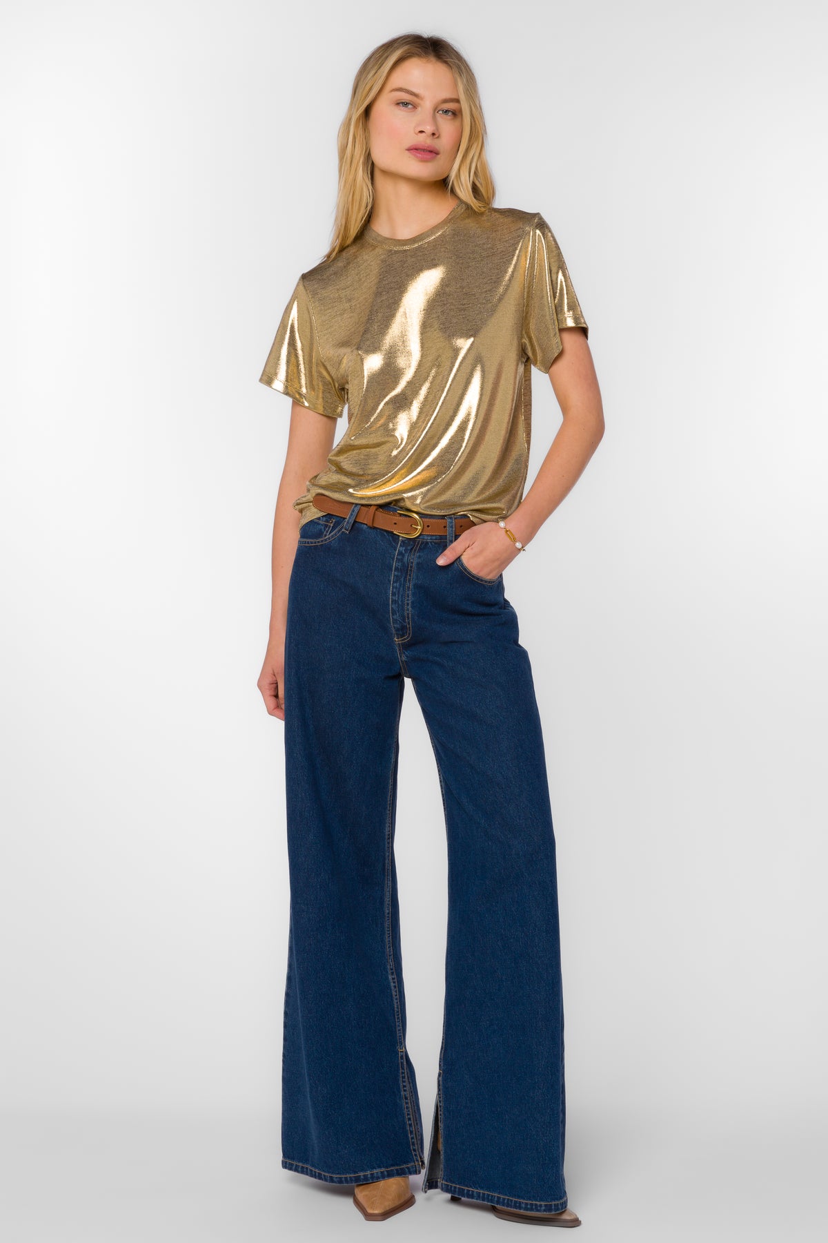 This short sleeve metallic tee features a round neckline, gentle stretch and a fluid drape.