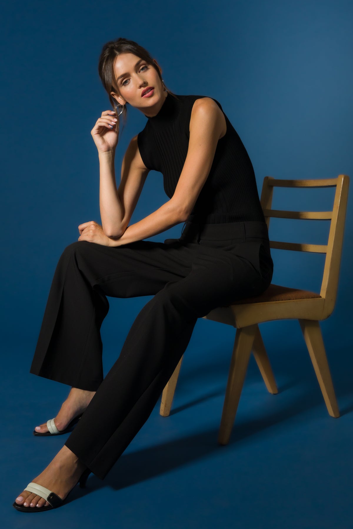 This sleeveless mock neck knit top features ribbed detailing, designed to hug the body with a smooth, stretchy feel and a polished, modern look.