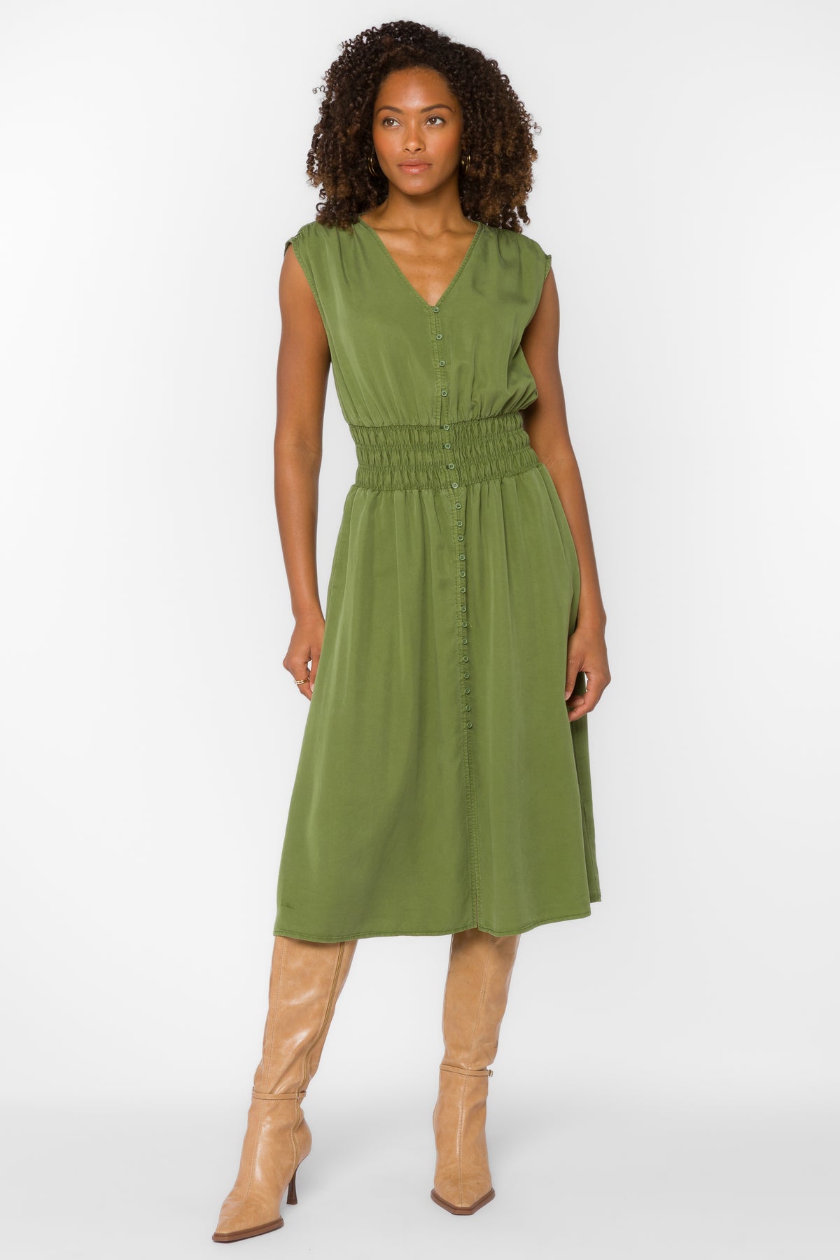This button up midi dress features a flowy, mid-length silhouette with a soft, weighty drape, V-neckline, smocked waist and side seam pockets.