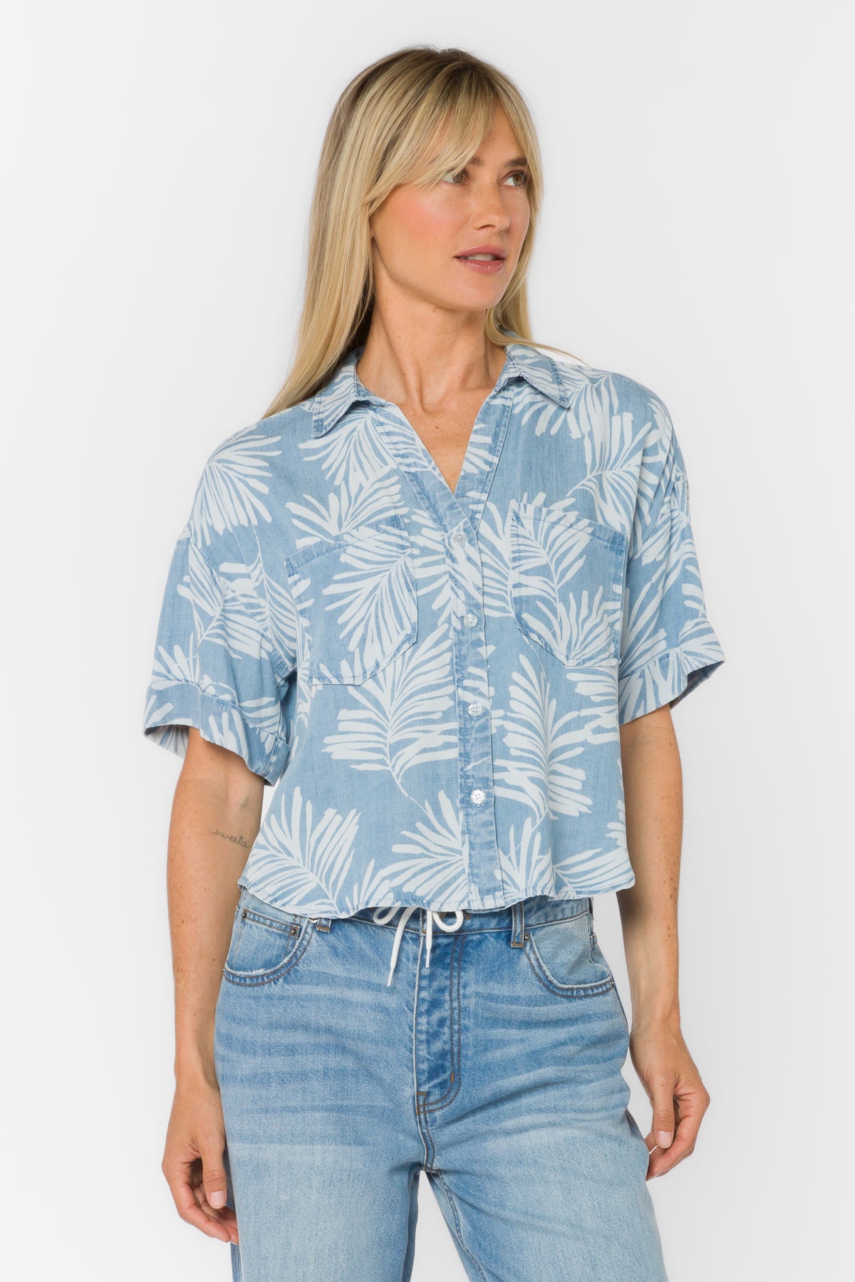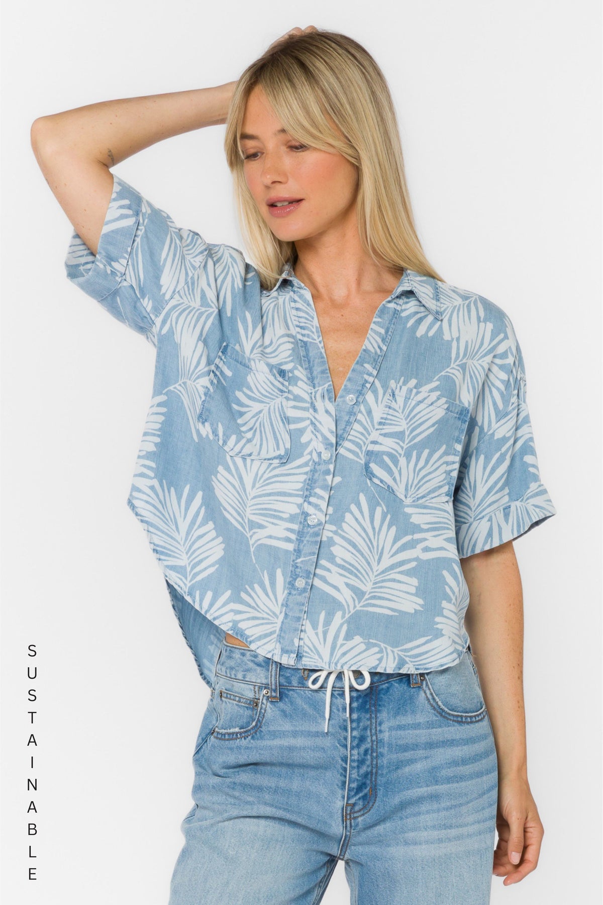 This relaxed fit split neck button front shirt features front patch pockets and a smooth airy feel.