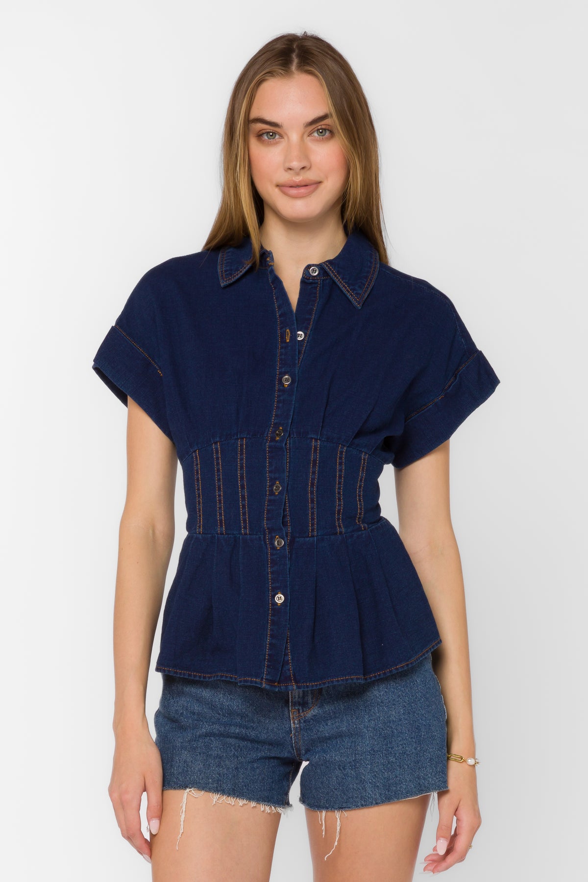 This short cuffed sleeve soft denim peplum shirt features Contrast stitching, pleated waist, smocked back detail and crafted from a soft lightweight cotton.