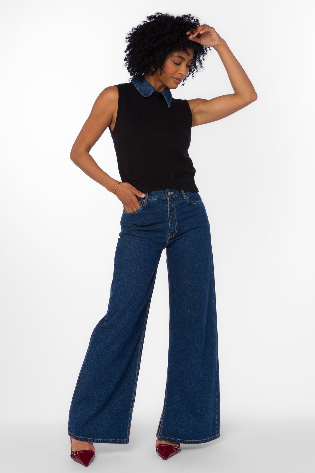 This sweater vest features a soft, cozy knit feel, and designed with a removable denim collar for a versatile layered look.