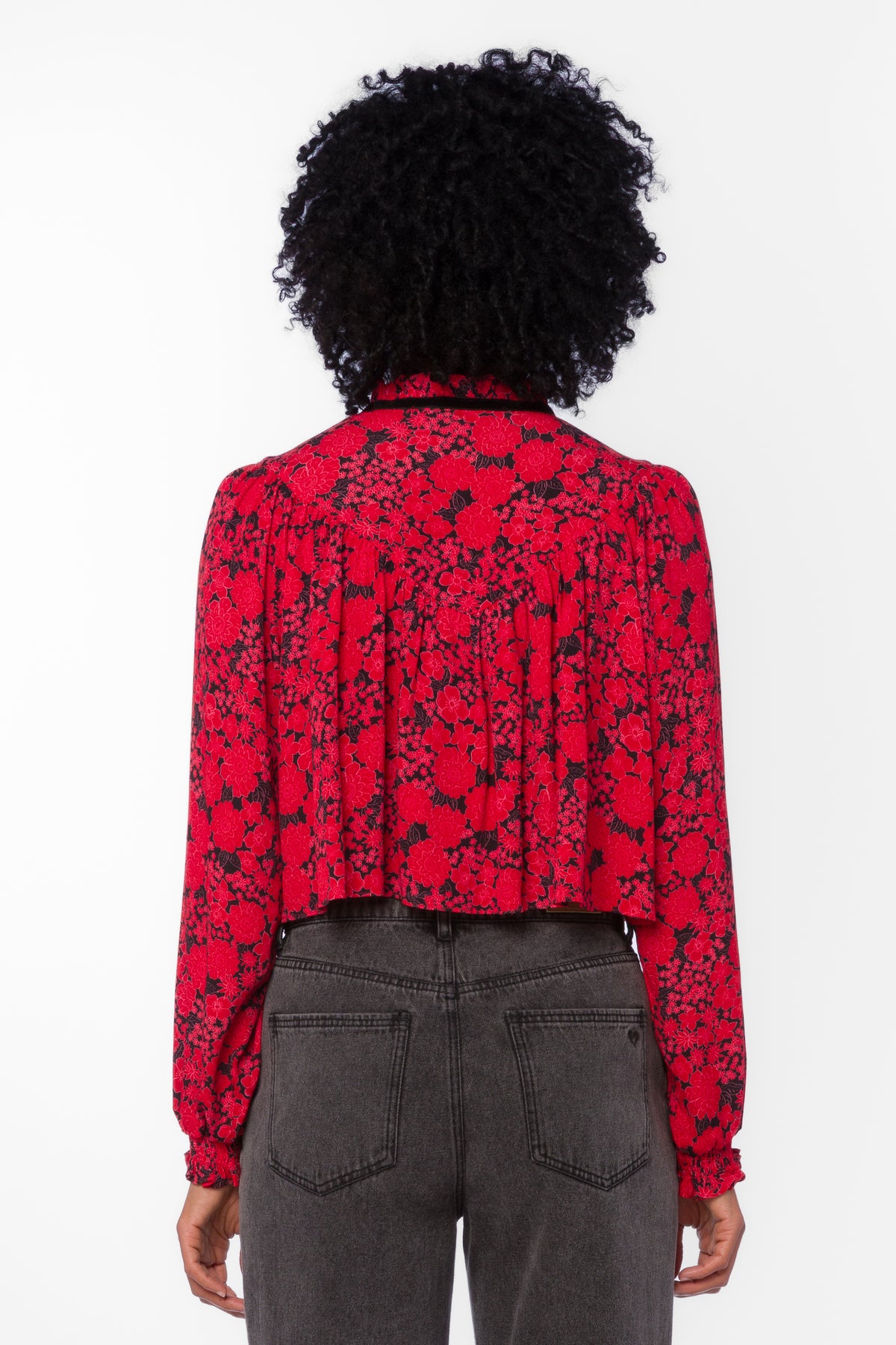 This long sleeve cropped blouse features smocked cuffs, a soft drape, textured hand feel and is finished with velvet trim and tie neck detail.