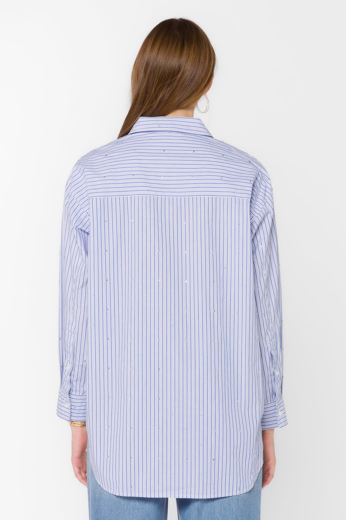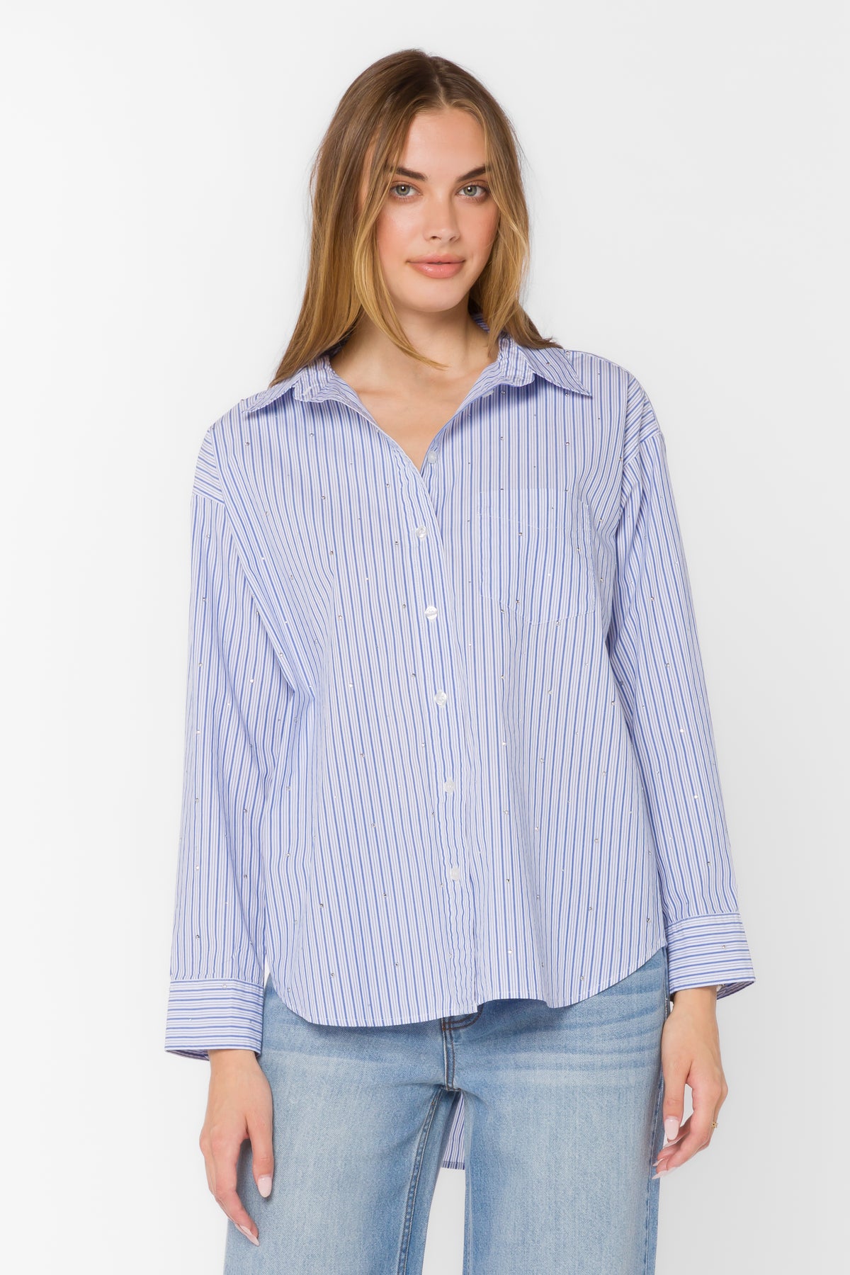 This oversized long sleeve button up shirt features an all-over rhinestone detail, a high low hem and a crisp feel.