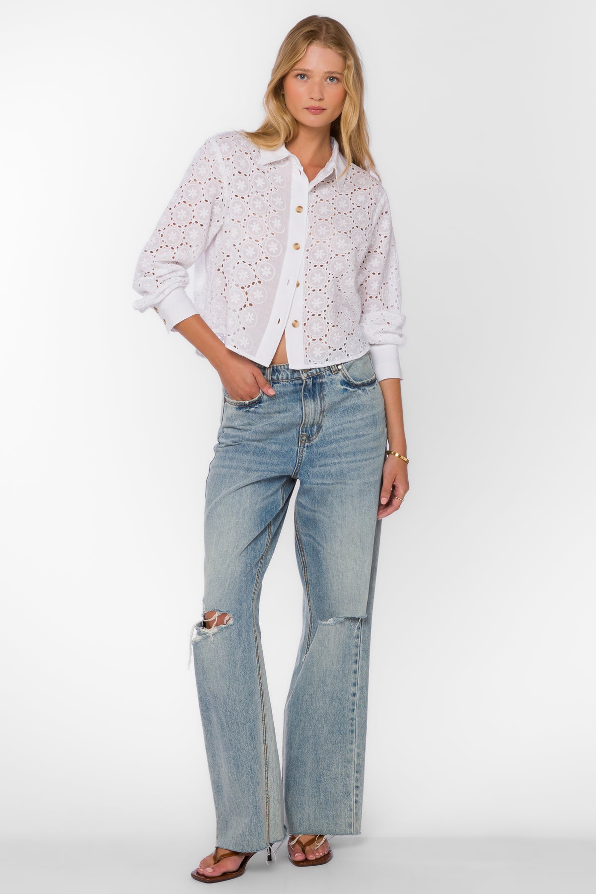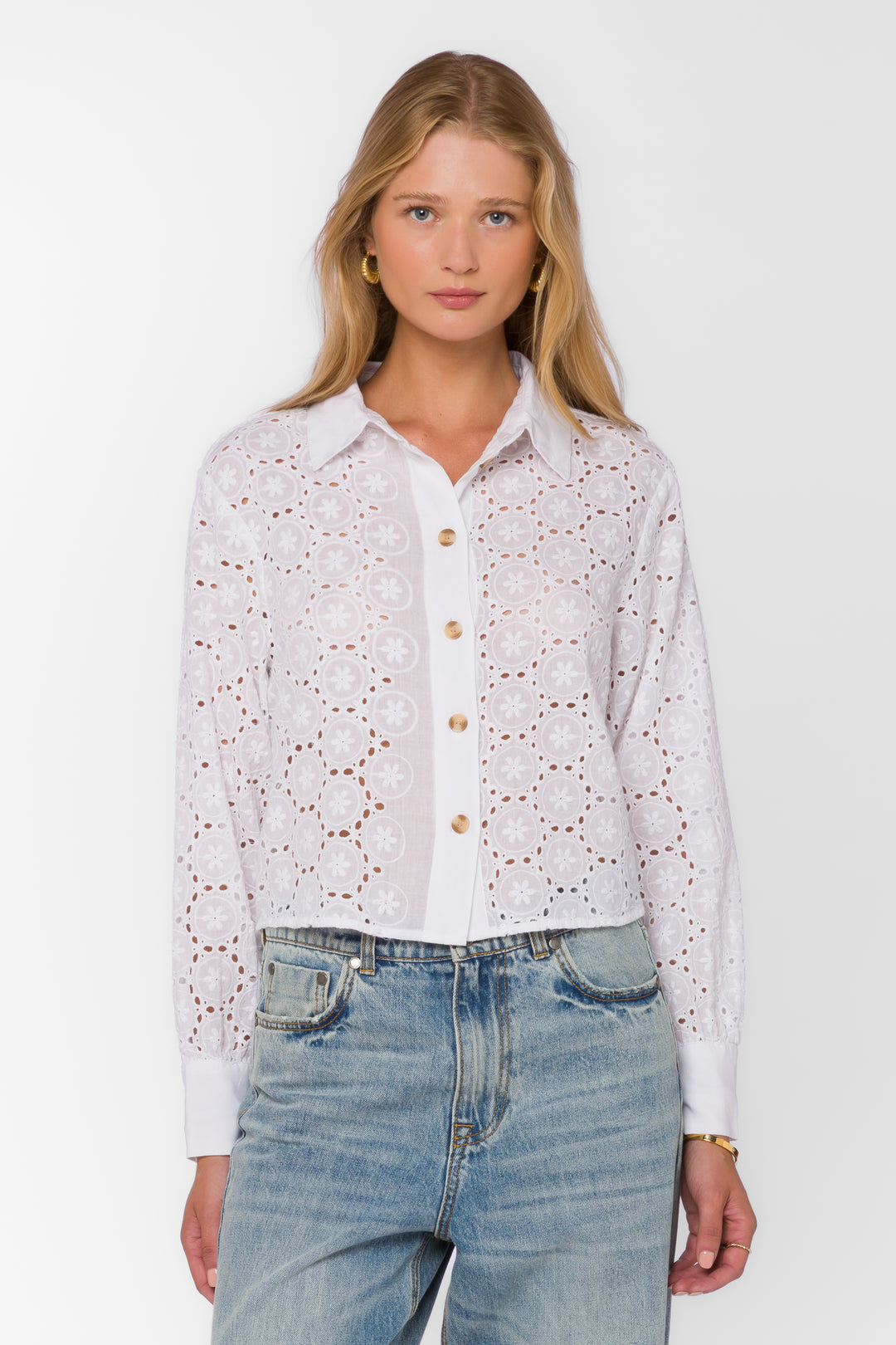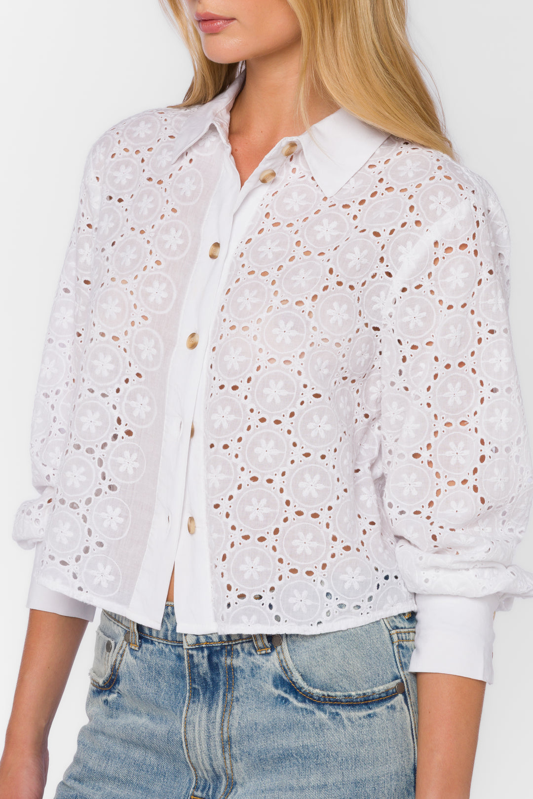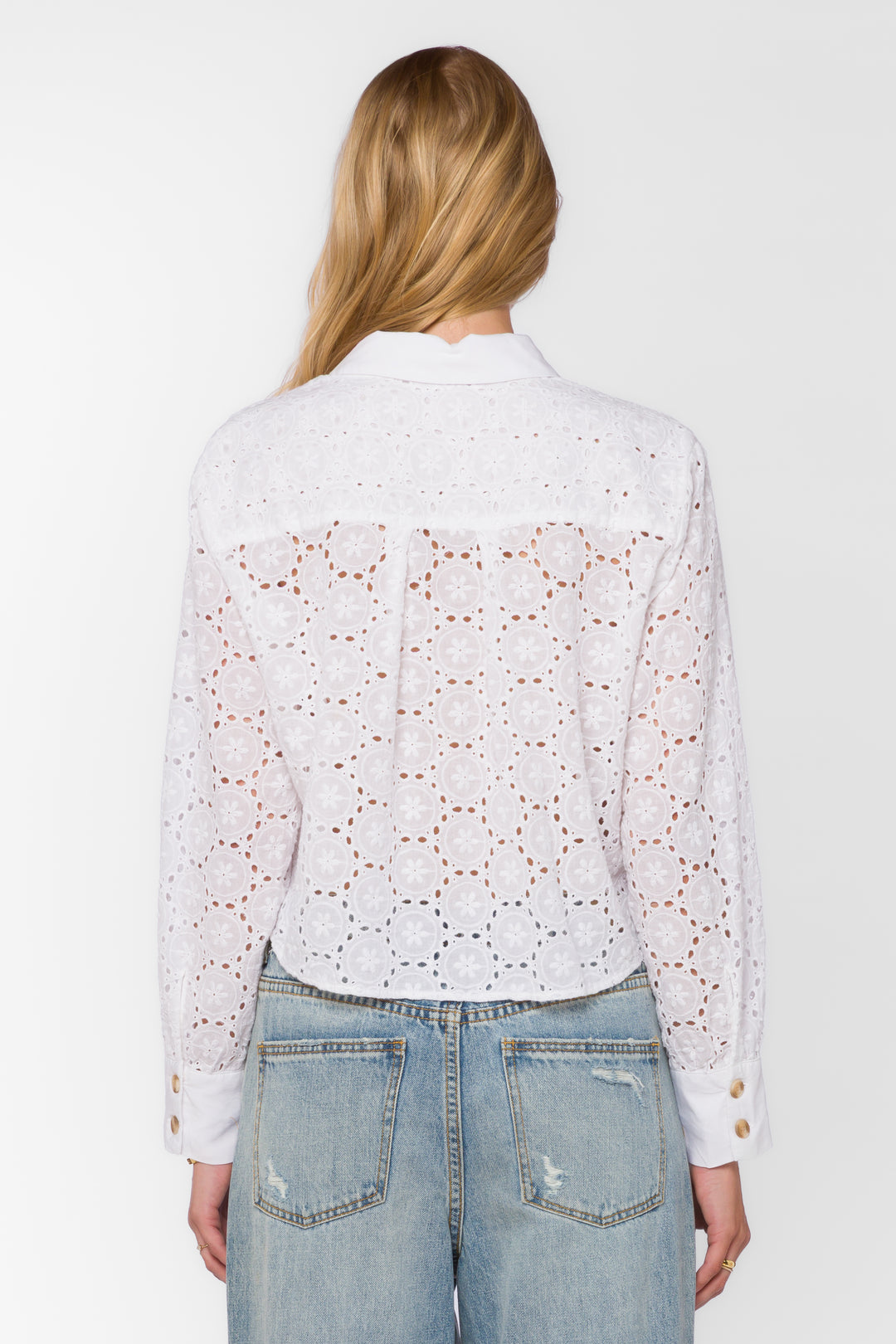 Step into style with the Lilith Optic White Shirt. This long sleeve crop button up eyelet shirt features a pleat back detail for added charm. The perfect crop top for any occasion, pair it with your favorite bottoms for a chic and versatile look.