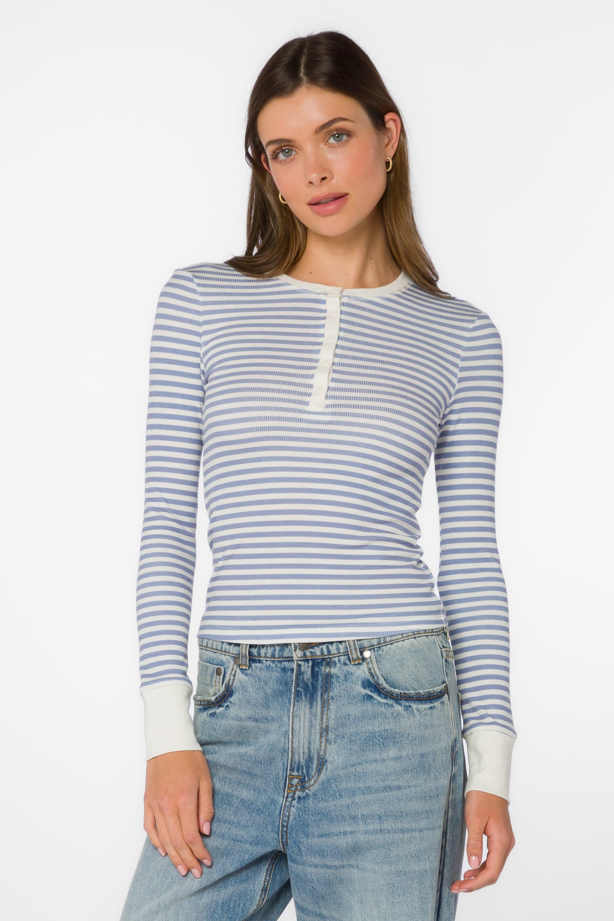 This striped ribbed long sleeve henley tee features a comfy stretch fit and is buttery to the touch.