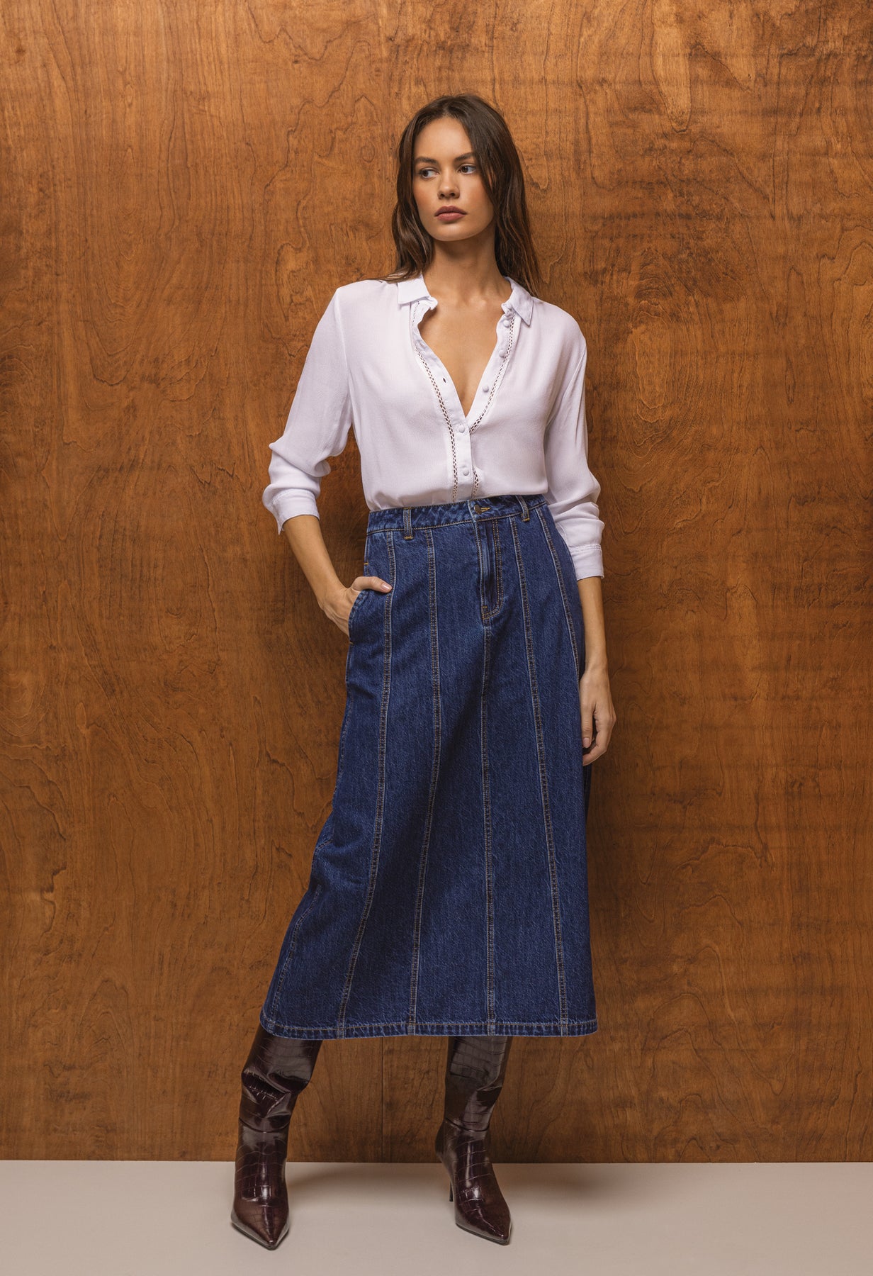 This long sleeve button up shirt drapes with ease, offering a soft, airy flow enhanced by its lightly textured surface and finished with delicate embroidered trim.