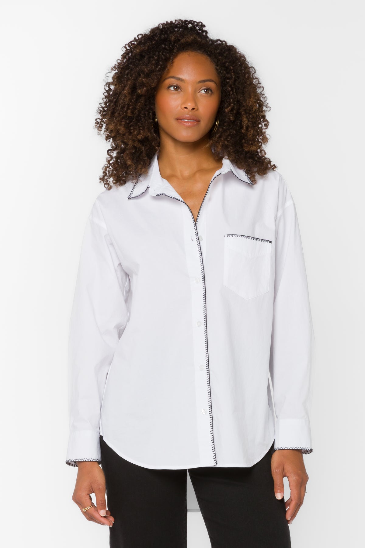 This long sleeve oversized shirt features a novelty embroidered trim, single patch pocket, and has a lightweight slightly structured feel.