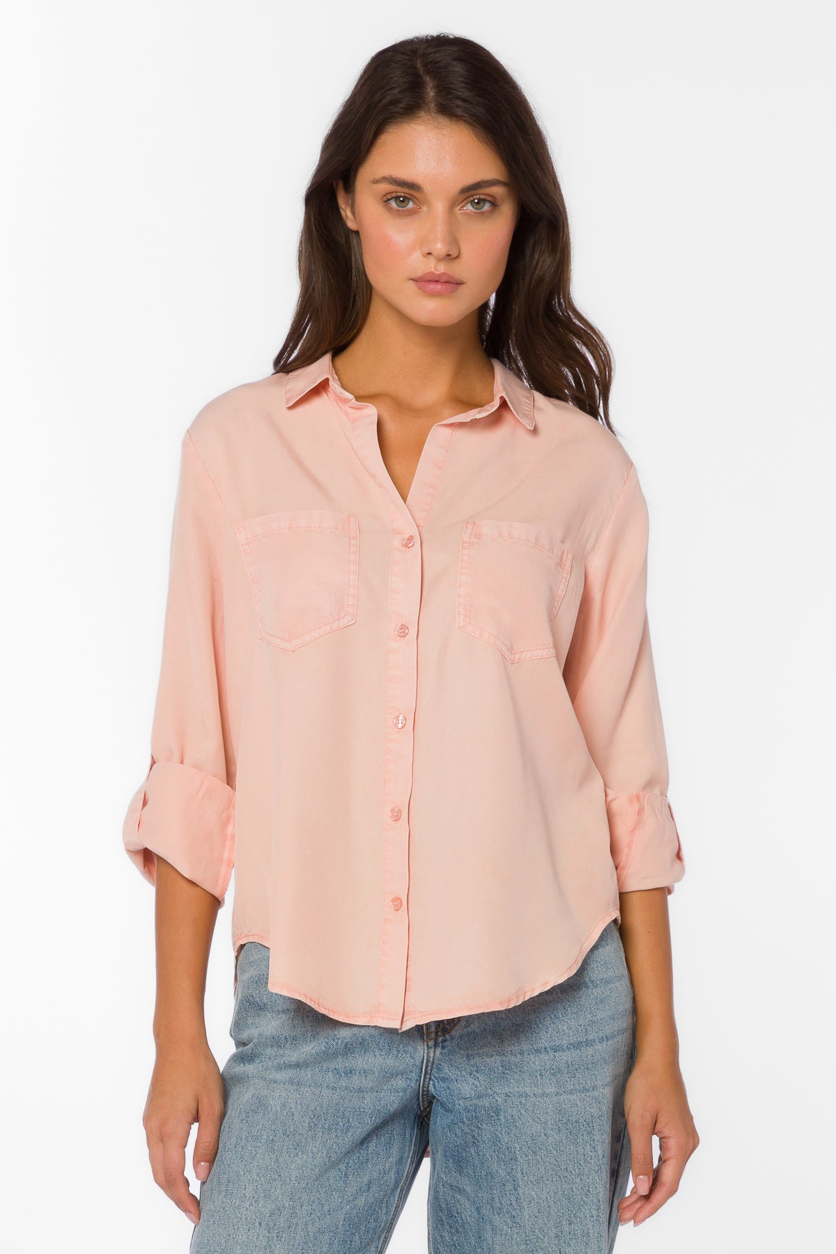 This soft draped button up shirt features rolled tab sleeves, front patch pockets, and a rounded hemline.