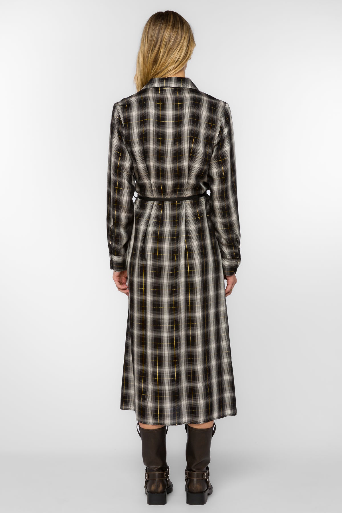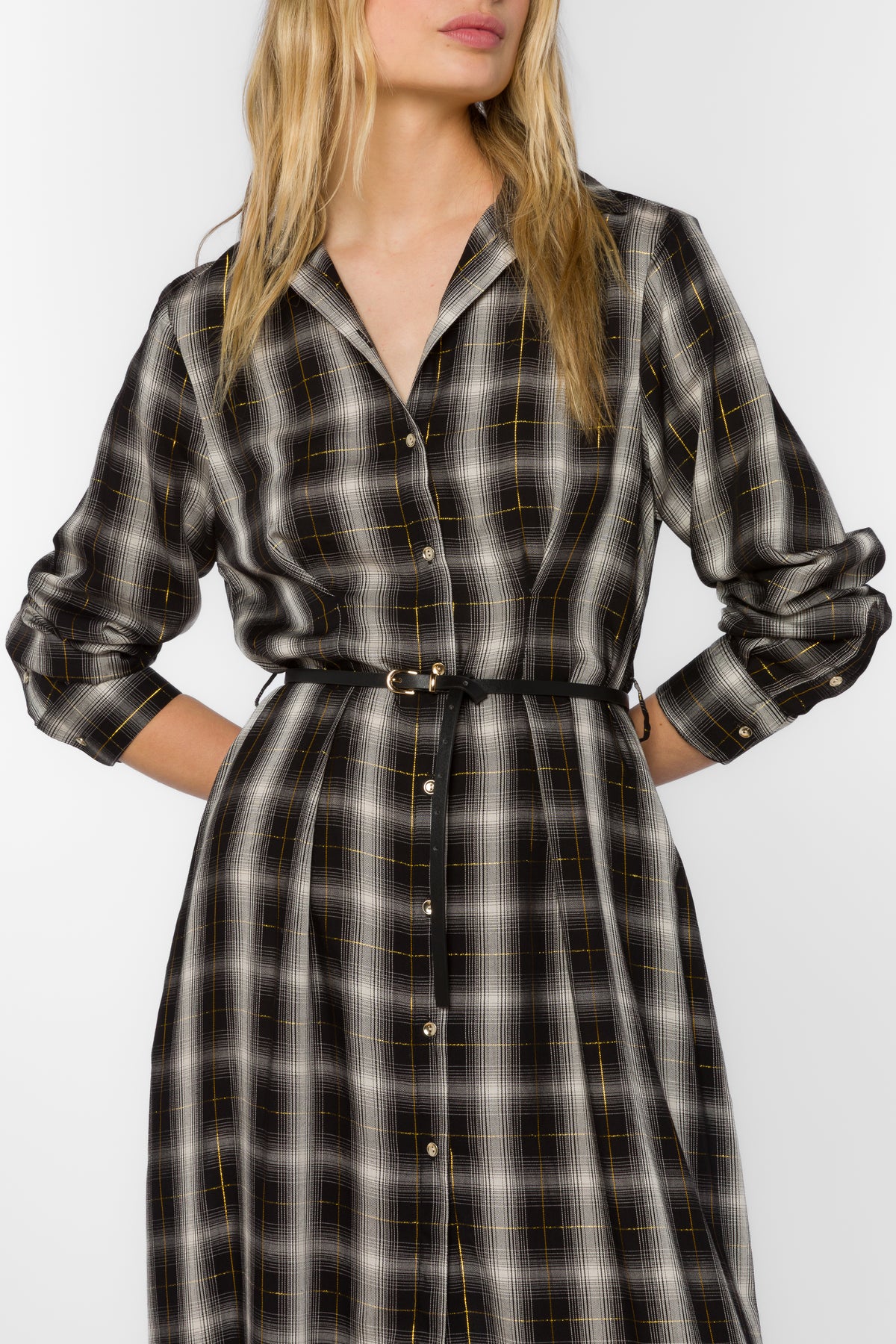 This long sleeve button up plaid midi dress features gold lurex detail throughout, a thin black belt, front slit, and has a soft lightweight feel.