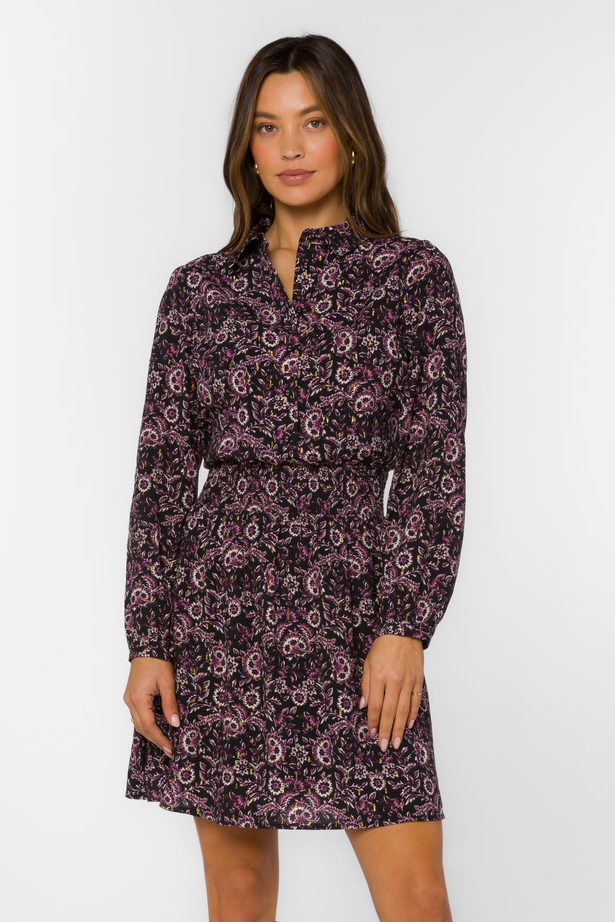This long sleeve mini dress features a smocked waist, soft drape and finished with delicate metallic lurex thread for a hint of shine.