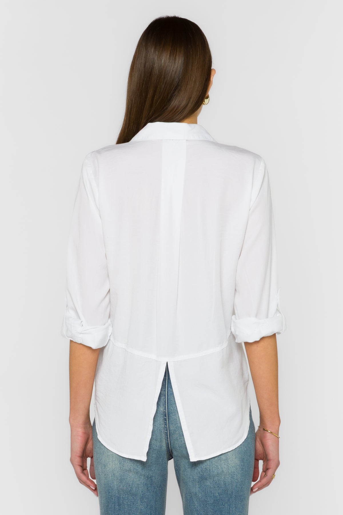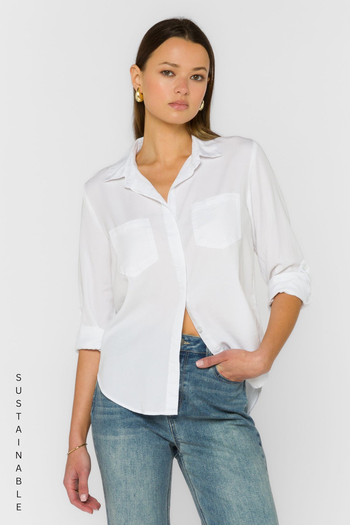 This button-up shirt features rolled short tab sleeves, chest patch pockets, a split back tail and crafted from 100% Eco-Friendly fabric for a soft, smooth and breathable drape.