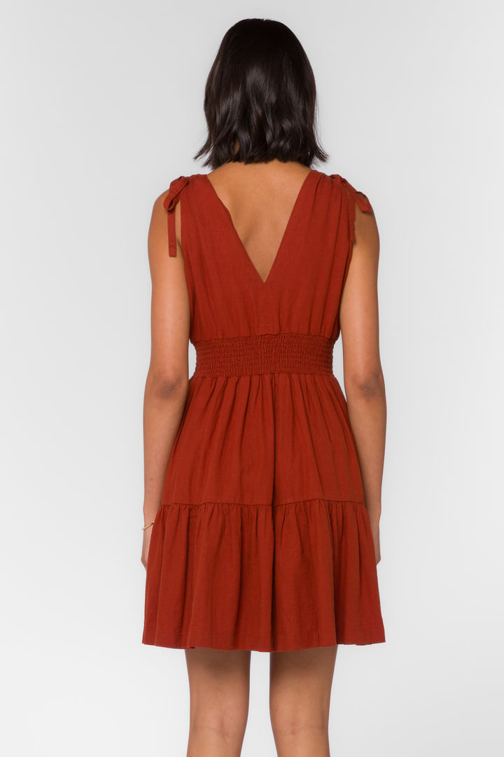 This V-neck tiered mini dress features a smocked waist, and adjustable shoulder tie details, crafted from a breathable linen-viscose blend for an airy, with a slightly textured feel.
