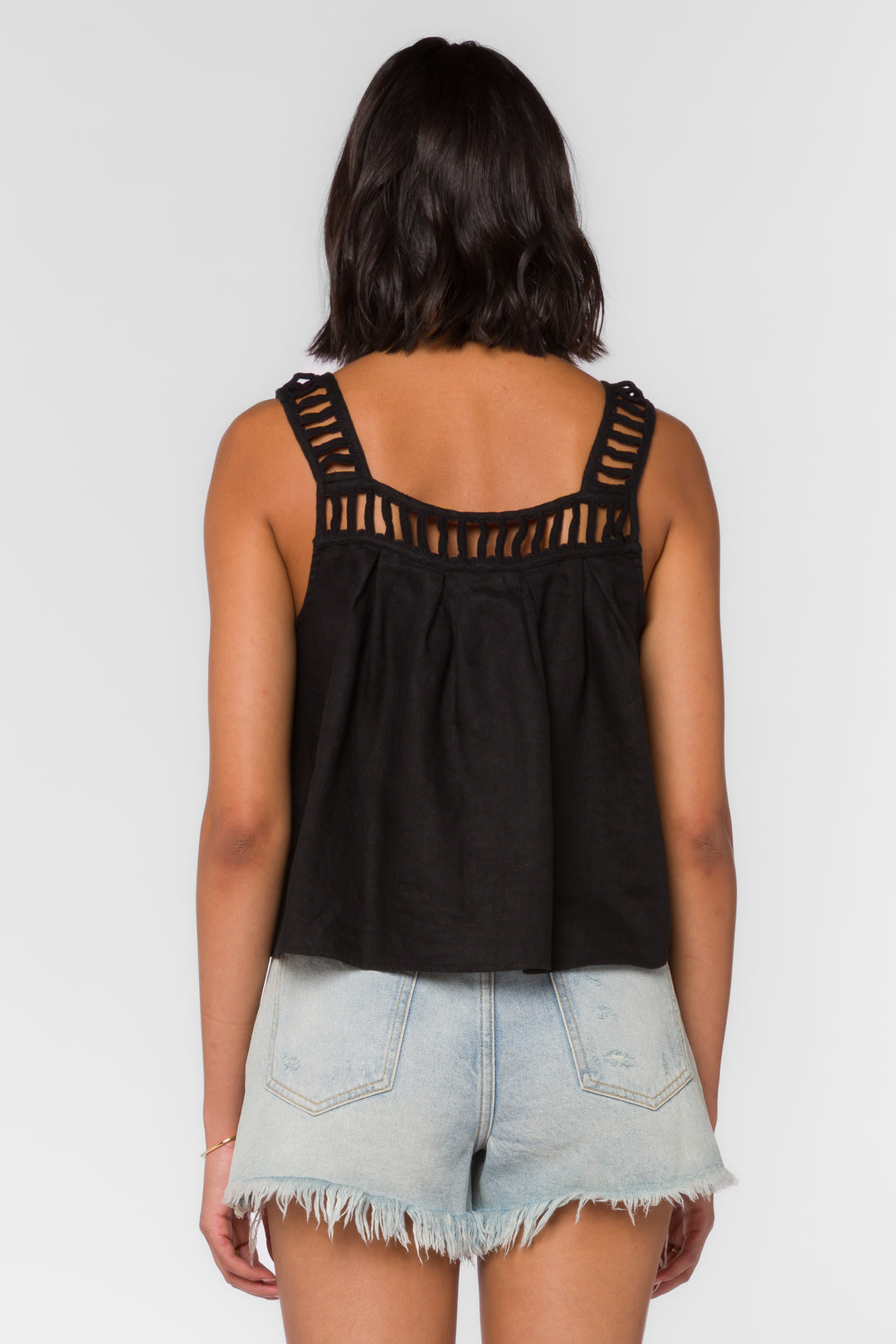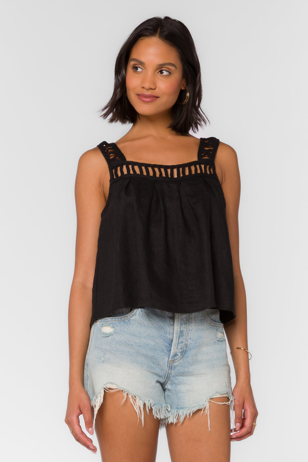 Lightweight and semi-sheer, the Keva Black Top is a soft linen A-line style with a square neck, cropped hem, and delicate cut-out trim for a breezy, feminine finish.