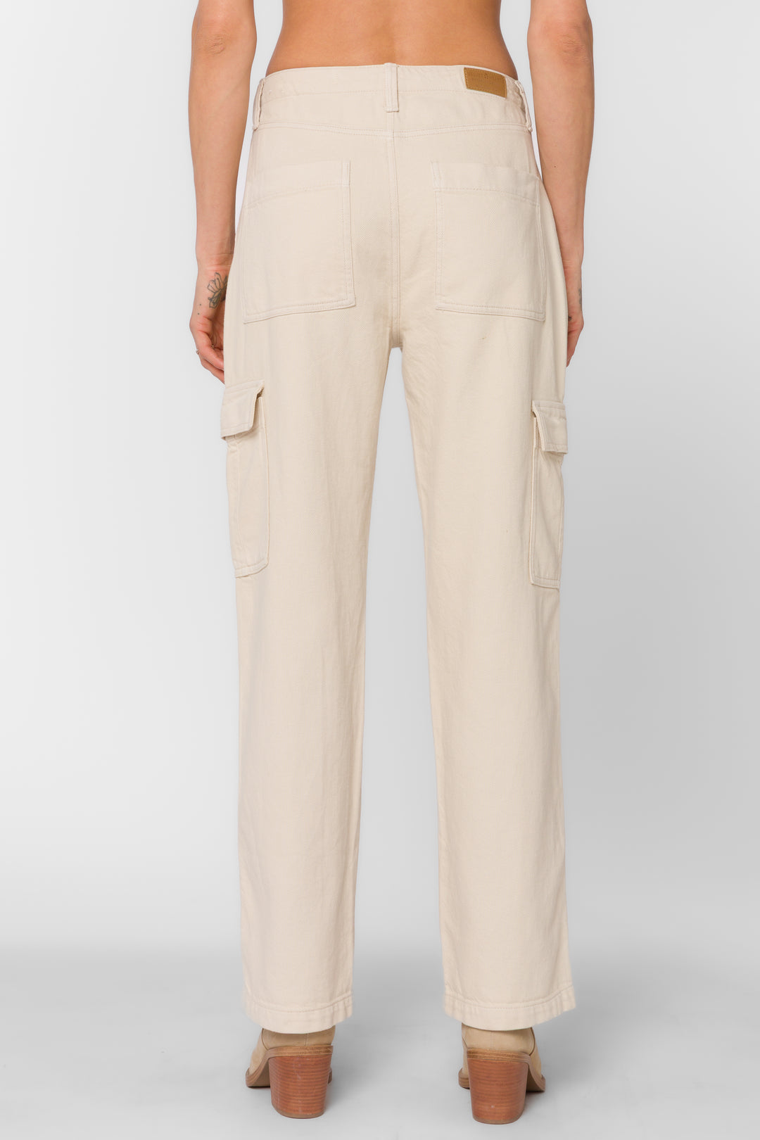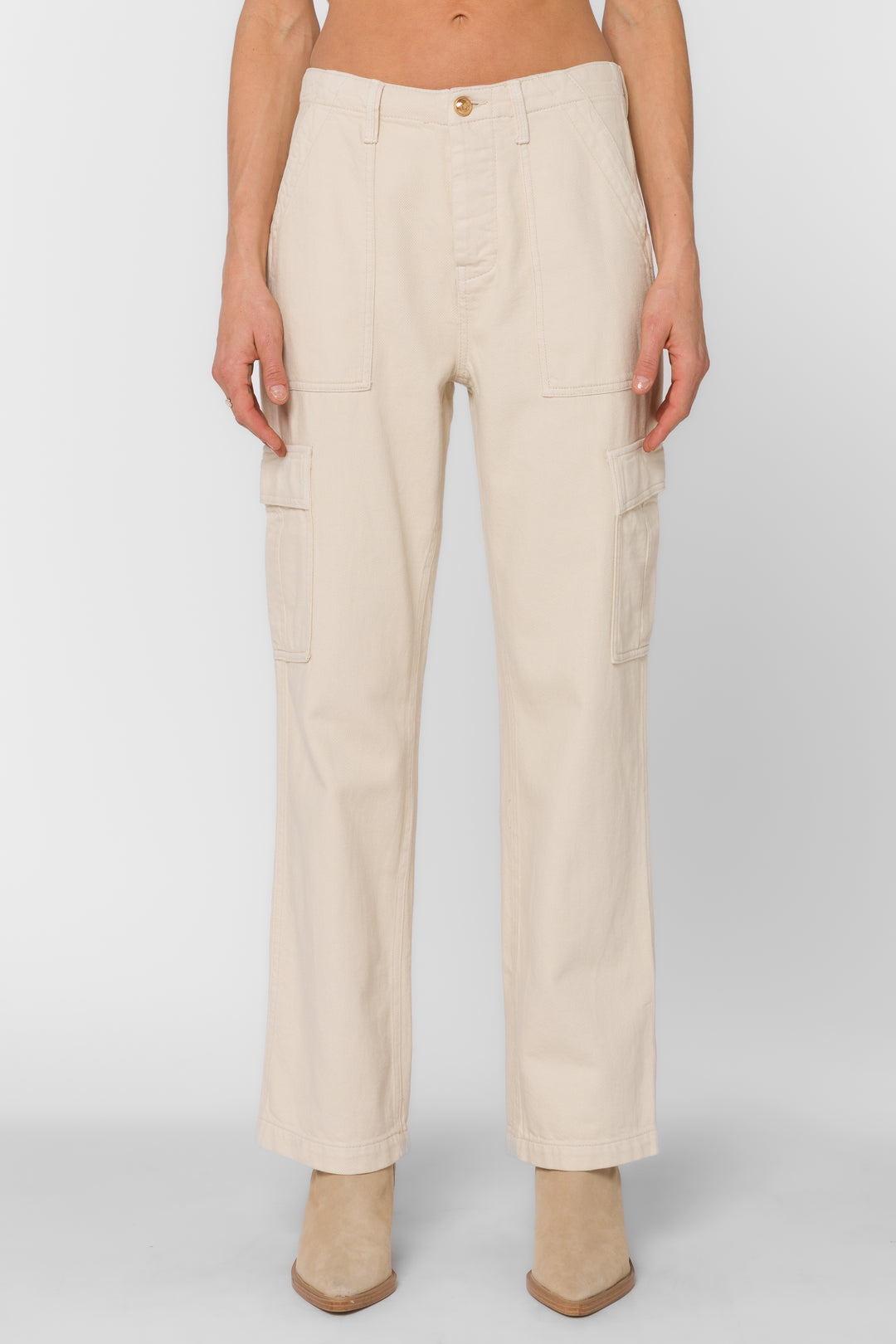 These relaxed high-rise cargo pants feature oversized front porkchop pockets and a classic button-zip closure, with a slightly structured feel.