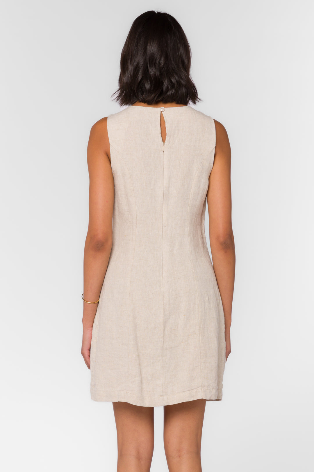 A timeless sleeveless mini dress with a sleek, fitted sheath silhouette. The Matilda is crafted from 100% linen, it offers breathable comfort and effortless elegance. Available in a natural wheat hue, it's perfect for sunny days or sophisticated evenings.